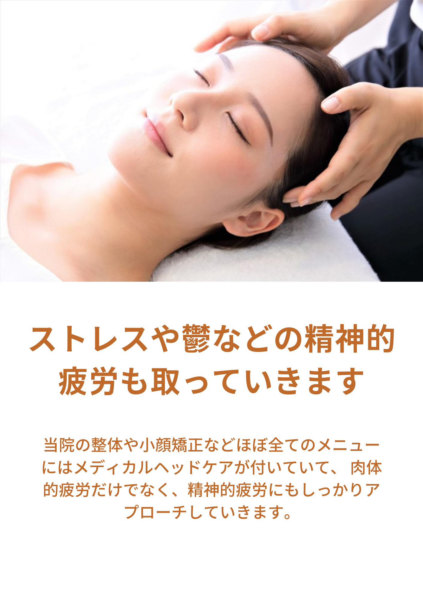当院の整体や小顔矯正などほぼ全てのメニューにはメディカルヘッドケアが付いていて、 肉体的疲労だけでなく、精神的疲労にもしっかりアプローチしていきます。