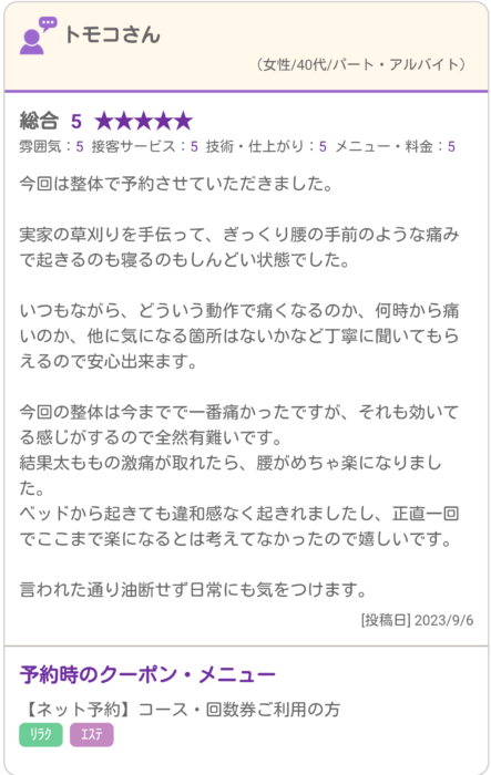 腰の痛みの根本原因がトモコさんの場合は太もも外側にあったので、一回でも大幅に取れたと思います。
